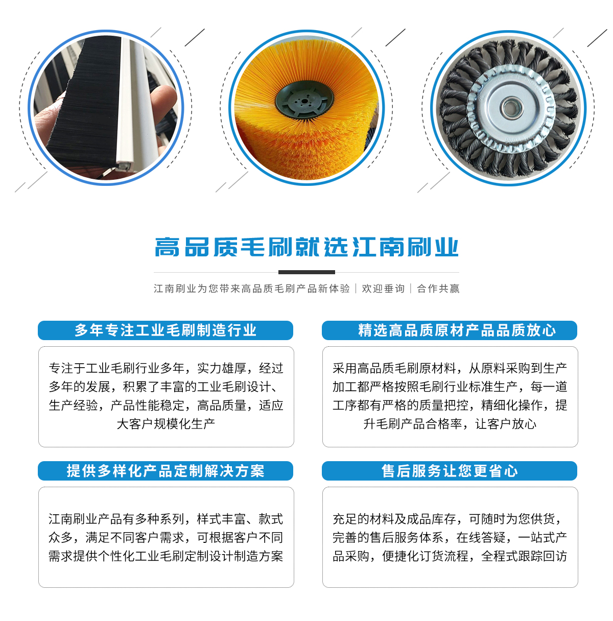潛山江南刷業(yè)有限公司生產(chǎn)各類脫脂線毛刷輥,前道刷洗箱毛刷輥,刷洗箱清洗毛刷輥,酸洗洗刷機(jī)毛刷輥,酸洗線毛刷輥,酸洗洗刷機(jī)鋼絲刷,干刷機(jī)鋼絲刷輥,涂油滾&膠輥&海綿滾&不織布輥、密封刷&鋼刷式密封、輸送帶刷式清掃器&牛...